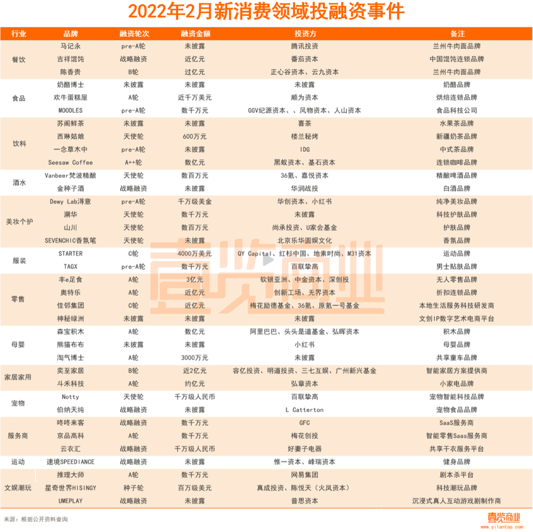 备注:融资以品牌或媒体披露时间为主,涉及多个赛道的首选品牌/企业的主营业务。对于向市场公开金额的融资,计算中用实际数字。对于没有公开的金额融资,部分融资额数据为估算值,计算方法如下:数十万=50万;数百万=300万;数千万=3000万;数亿=30000万;近亿及亿元=10000万;千万级=1000万;百万级=100万。外币经过换算,未披露融资金额暂不计入。