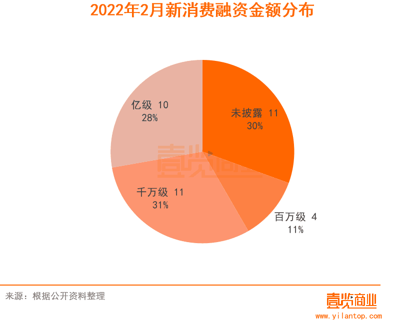 从融资金额来看,除了未披露融资金额的11个项目之外,2月的融资金额主要集中在千万级和亿元级。其中,获千万级融资的品牌有11个,融资金额为3.58亿元;获亿元级融资的品牌有10个,融资金额为18.56亿元,占总融资金额的83%;获百万级的品牌有4个,融资金额仅为0.18亿元。