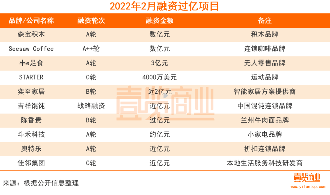 其中,亿元级融资主要集中在零售、餐饮、家居家用等领域。此外,服装、母婴、饮料等领域也有亿元级融资分布。