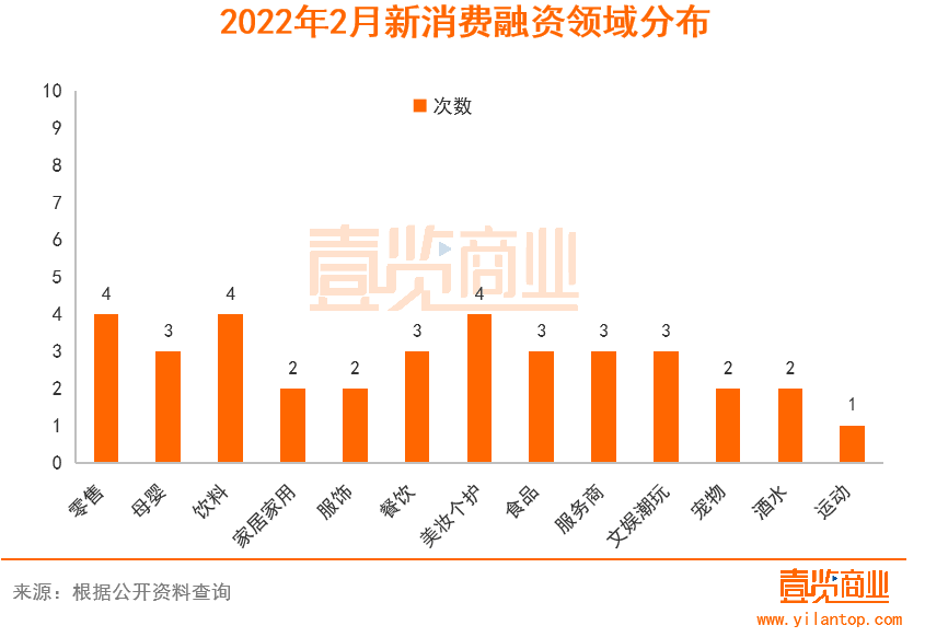 从行业来看,新消费的融资相对分散,且融资数量都普遍偏低,最高仅为4起。但可以看出,零售和饮料依旧受到关注,而在1月最受关注的餐饮本月仅发生3起融资,数量减少7起。