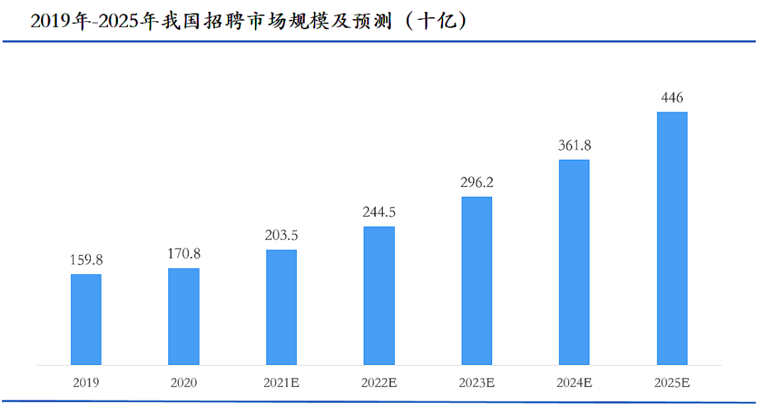 其中,据灼识咨询数据显示,2020年我国招聘服务的市场规模为1708亿元,年复合增长率为21.2%。2025年招聘市场规模或将达到4460亿元,而整个人力资源服务市场规模更将达到1.3万亿元。