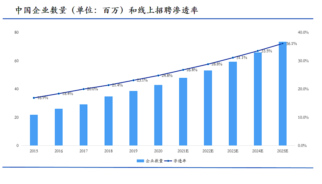 据灼识咨询数据显示,求职者线上渠道求职的渗透率已从2015年的11.3%提高到2020年的17.9%,企业线上招聘渗透率已从2015年的16.9%上升到2020年的24.8%。当然,这也会带动线上招聘市场规模的扩大。