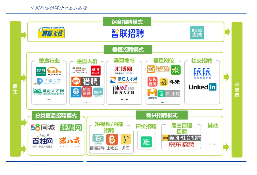依托于互联网技术的快速发展,在线招聘也已从传统的综合招聘逐步进入多元扩展时期,覆盖整个招聘行业各个环节,逐步完善填充并打造行业全产业链。