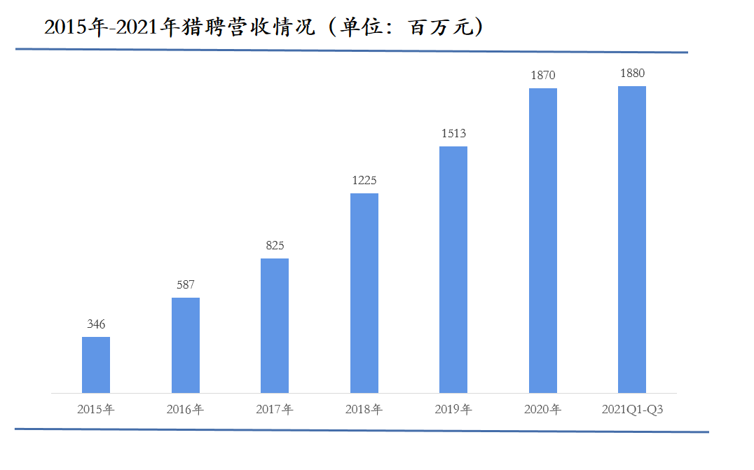 猎聘则通过深耕中高端人才在线招聘,形成客户基础+SaaS+交易闭环,这也让猎聘B+H+C的用户数量都在增长。以2021年3季度为例,猎聘企业用户数量、猎头端数量、用户数量分别为94.61万人、19万人、7160万人。较同期涨幅比例分别为38.7%、13.6%、16.6%。