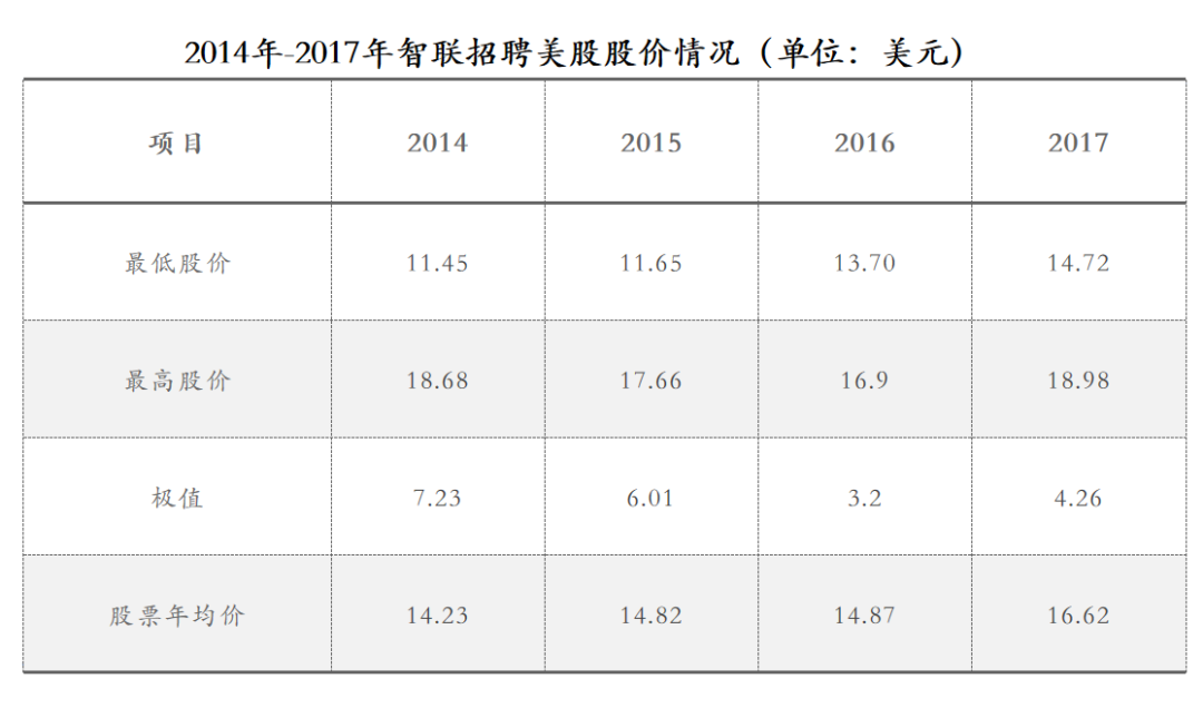 其实,当年智联招聘之所以选择退市原因如下,首先,智联招聘作为中概股其上市后市值被严重低估。智联招聘当时上市时每股发行价为13.5美元。但在2014年-2017年这4年的时间中,智联招聘的股价波动幅度很小。因中西方文化不同,提到互联网招聘,外国投资者首先联想到的是Linkedin 社交招聘,但这其实与智联招聘根本不同。