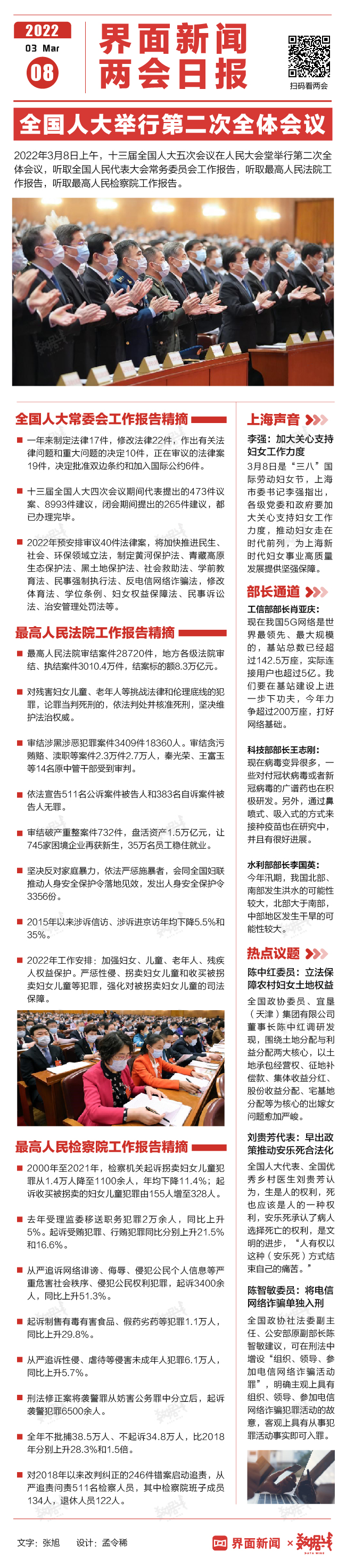 2022年3月8日上午,十三届全国人大五次会议在人民大会堂举行第二次全体会议,听取全国人民代表大会常务委员会工作报告,听取最高人民法院工作报告,听取最高人民检察院工作报告。