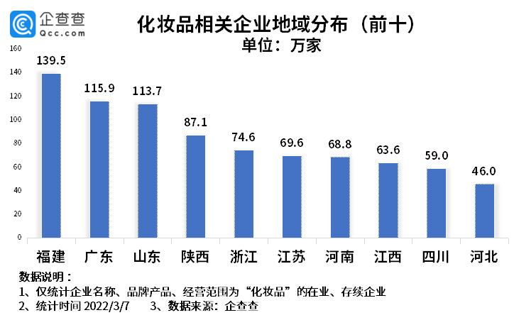 企查查数据显示,截至2022年3月,我国共有在业存续的化妆品相关企业1247.1万家,其中福建省以139.5万家排名第一,广东省、山东省分列二三名。从注册量上看,近10年全国化妆品相关企业注册量总体呈波动上升趋势,2020年注册量达279.8万家,同比增长10.9%。2021年共新增437.5万家相关企业,同比增长56.3%,是近十年注册量最多的一年。从注册资本上看,75%的企业注册资本在100万以内。