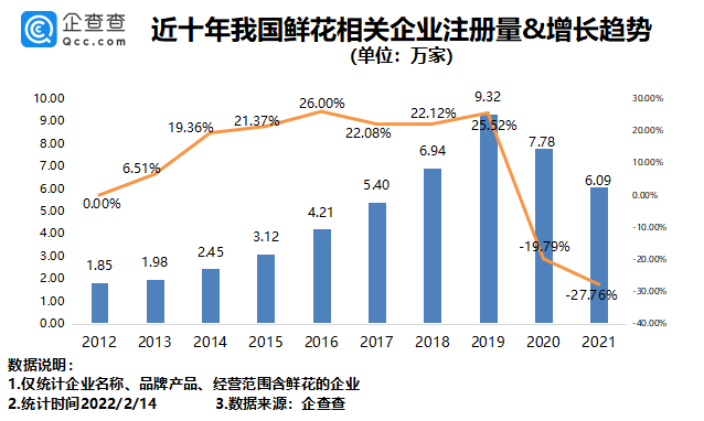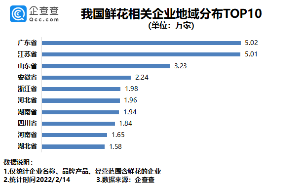 企查查数据显示,截止今年2月中旬,我国现存鲜花相关企业41.05万家。近十年来,我国鲜花相关企业注册量整体呈上升趋势。2019年我国新增鲜花相关企业9.32万家,同比增长25.52%,是近十年新增最多的一年。2020年新增7.78万家,同比减少19.79%。2021年新增6.09万家,同比减少27.76%。从区域分布来看,广东省以5.02万家鲜花相关企业排名第一,江苏省、山东省分别有5.01万家、3.23万家,排名前三。