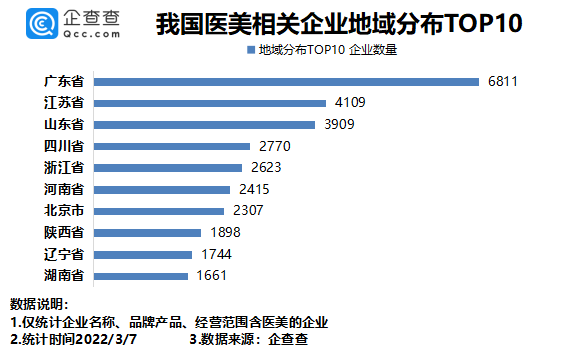 企查查数据显示,截至2022年3月,我国目前现存医美相关企业4.98万家。近3年来,我国医美相关企业注册量整体呈上升趋势。2019年新增8994家,同比增长1.07%。2020年新增8855家,同比减少1.55%。2021年新增1.13万家,同比增长27.92%。从区域分布来看,广东以6811家医美相关企业排名第一。江苏、山东分别有4109家、3909家,排名前三。其次是四川、浙江等省份。