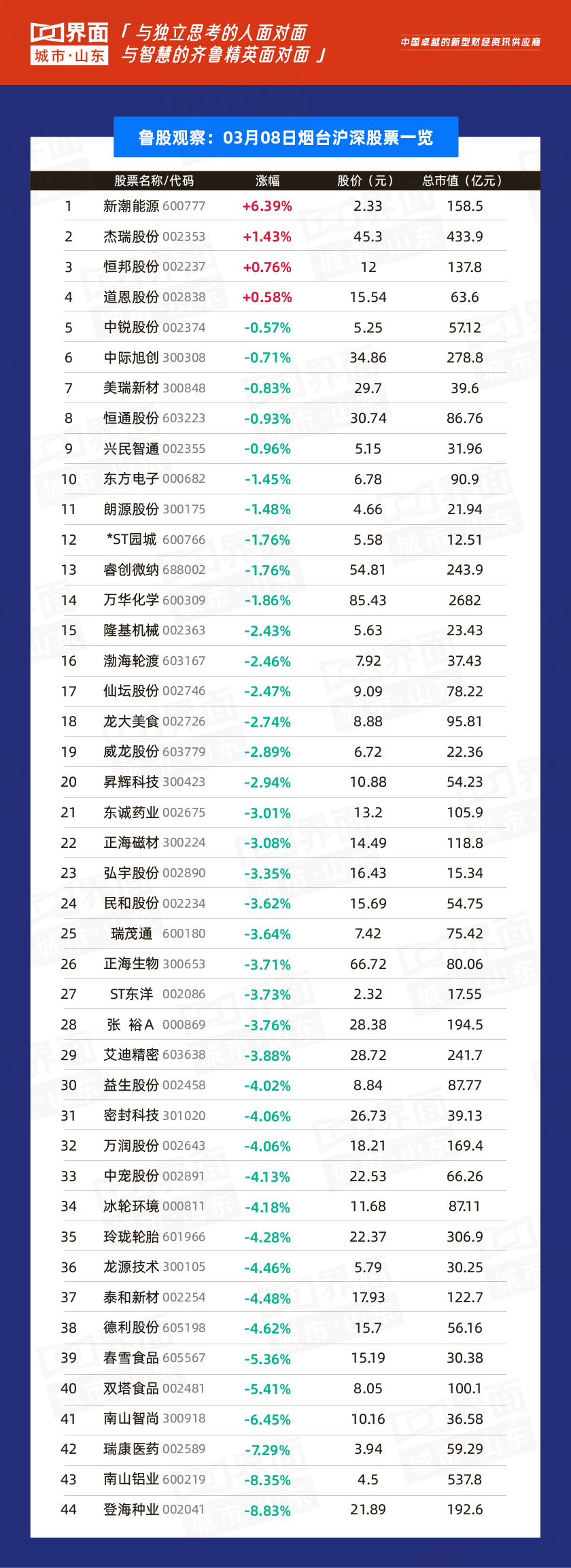 总市值过千亿的有万华化学(600309)、海尔智家(600690)、歌尔股份(002241)、中航沈飞(600760)、潍柴动力(000338)、青岛啤酒(600600)、兖矿能源(600188),共7家,500亿-1000亿的共有4家,山东黄金(600547)、华鲁恒升(688363)、南山铝业(600219)、中泰证券(600918),华熙生物(688363)。截至收盘个股股价最高为石大胜华(603026),收于144.9元;最低为山东钢铁(600022),收于1.78元。