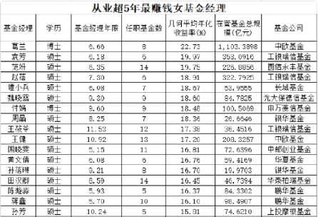 她也成为唯一一位任职5年以上,几何平均年化收益率超过20%的女性基金经理。工银瑞信基金的袁芳,圆信永丰基金的范妍也以接近20%的收益率紧随其后。