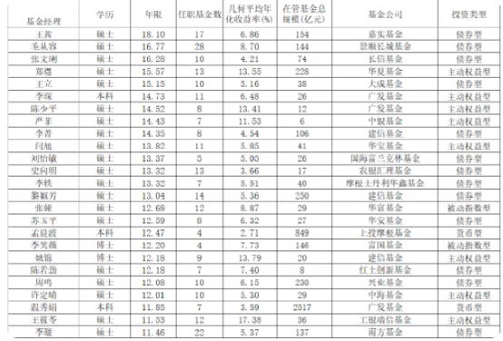 公募基金方面,嘉实基金王茜从业年限最长,做基金经理已有18年。在主动权益型基金中,华夏基金郑煜在15年多的基金经理生涯中,平均年化收益率达到了13.55%。此外,广发基金陈少平,中银基金严菲,建信基金姚锦,工银瑞信基金王筱苓,都属于10年以上平均年化收益率超过10%的基金经理。
