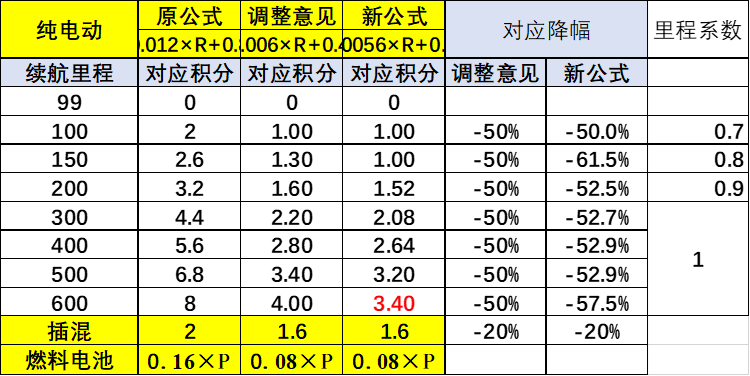 新修改的政策显示,2021-2023年纯电动单车积分最高由之前的5分降到3.4分;而插电式混合动力汽车的单车积分由此前的2分下调20%至1.6分。