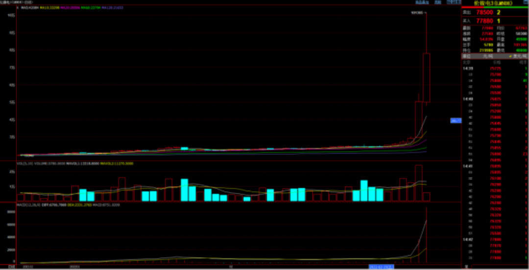 在LME的隔夜盘中,镍日内最大拉涨89%,最高达55000美元/吨。到凌晨收盘,LME市场上镍价收涨76%,至50905美元/吨,为2007年6月以来最高水平。如果说此时镍价还有来有往,处在震荡上行的阶段,等到白天亚洲交易行情开启,镍价的疯狂攀升让所有人目瞪口呆。