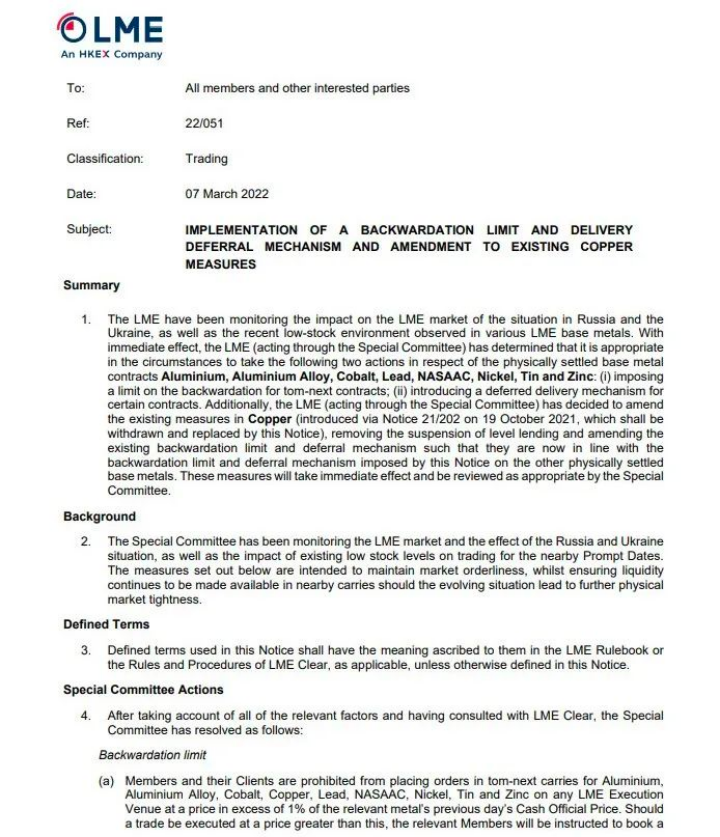 值得注意的是,在3月7日LME盘后时间,伦敦交易所宣布规则调整。新规则表示,在研究了俄乌局势的市场影响以及近期多种基本金属的低库存环境后,要求会员及其客户禁止在任何LME执行地点以超过相关金属前一天现货官方价1%的价格下达铝、铝合金、钴、铜、铅、北美特种铝合金、镍、锡和锌的明日/次日套利指令。