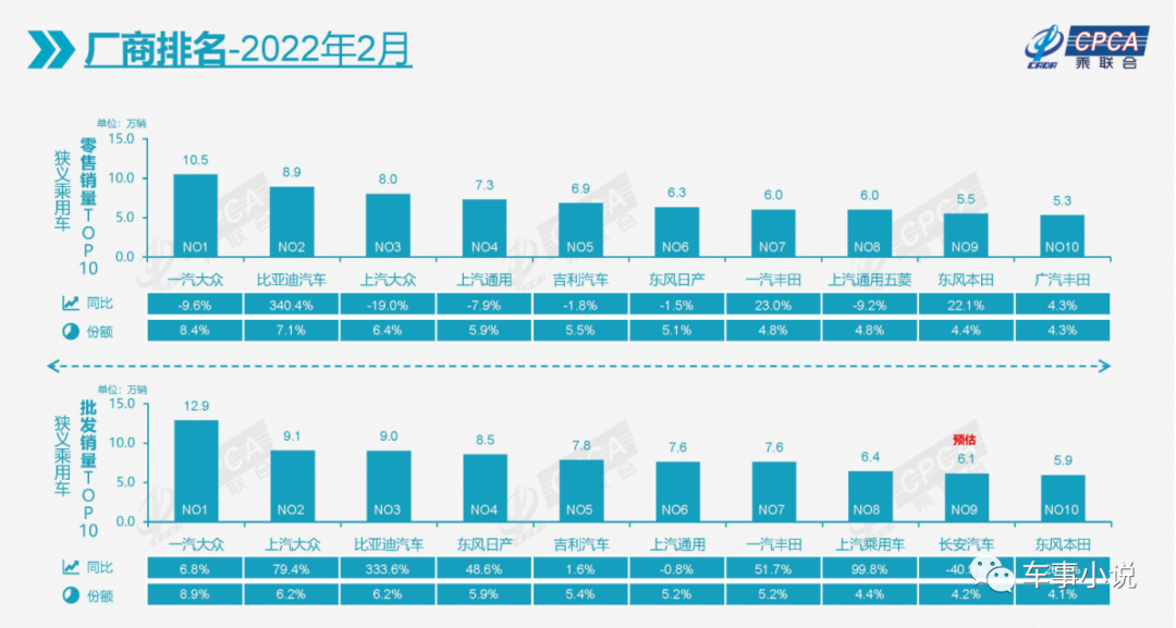 具体而言,2月份,自主品牌实现零售54万辆,同比增长14%,环比下滑42%。合资品牌实现零售55万辆,同比下降1%,环比下降36%。豪华品牌实现零售16万辆,同比下降3%,环比下降44%。