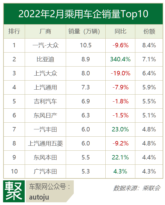 一汽丰田2月销售6.0万辆,同比增长23.0%,位居第7;东风本田5.5万辆,增长22.1%;广汽本田5.3万辆,同比增长4.3%。