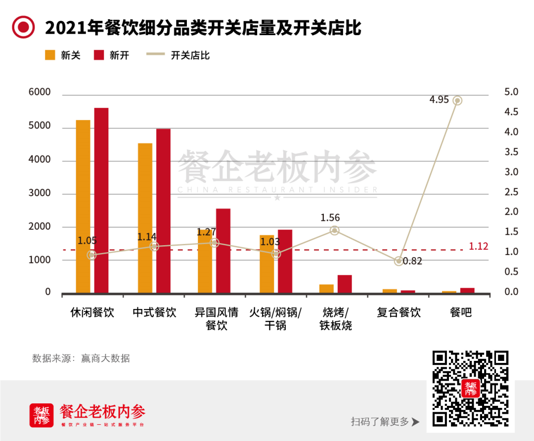 2020上半年,餐饮业遭遇疫情影响,整体开关店比骤降至0.73。而到了2021年,餐饮业回温,整体开关店比1.12,呈现小幅扩张,大多数细分品类比值均大于1。