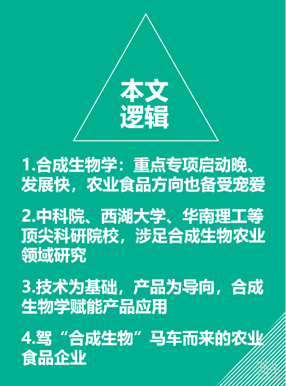 近几年,合成生物学无论在医疗、农业、食品等领域都备受关注,从技术端到对应的产业落地,从研究项目中寻找未来产业机遇,也是35斗研究国家项目的主要原因之一。