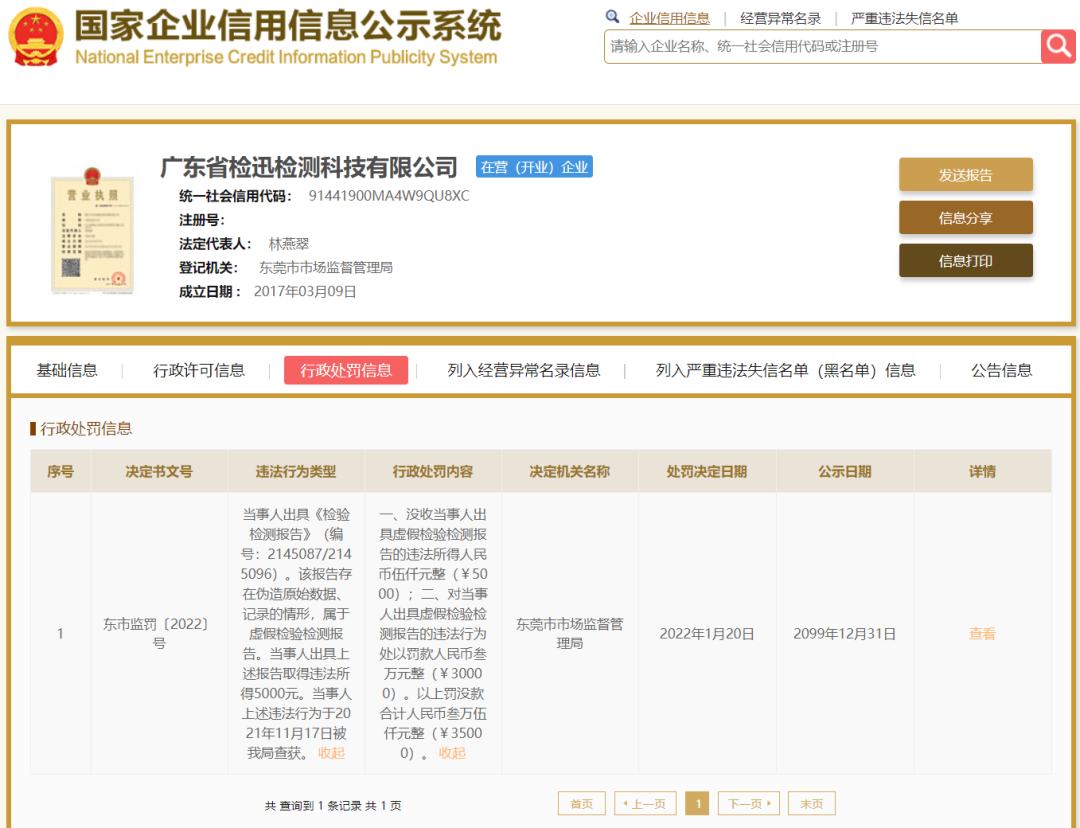 由此,今年1月20日,广东检迅检测被东莞市市监局进行行政处罚,罚没共计3.5万元,违法行为类型为“出具的《检验检测报告》存在伪造原始数据、记录的情形,属于虚假检验检测报告”。