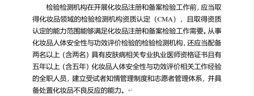 另据《化妆品注册和备案检验工作规范》(下称《规范》),检测机构须取得化妆品领域的检验检测机构资质认定(CMA),且取得资质认定的能力范围能够满足化妆品注册和备案检验工作需要。从事人体安全性与功效评价检验的机构,还应当配备具备一定资历的专业人才。