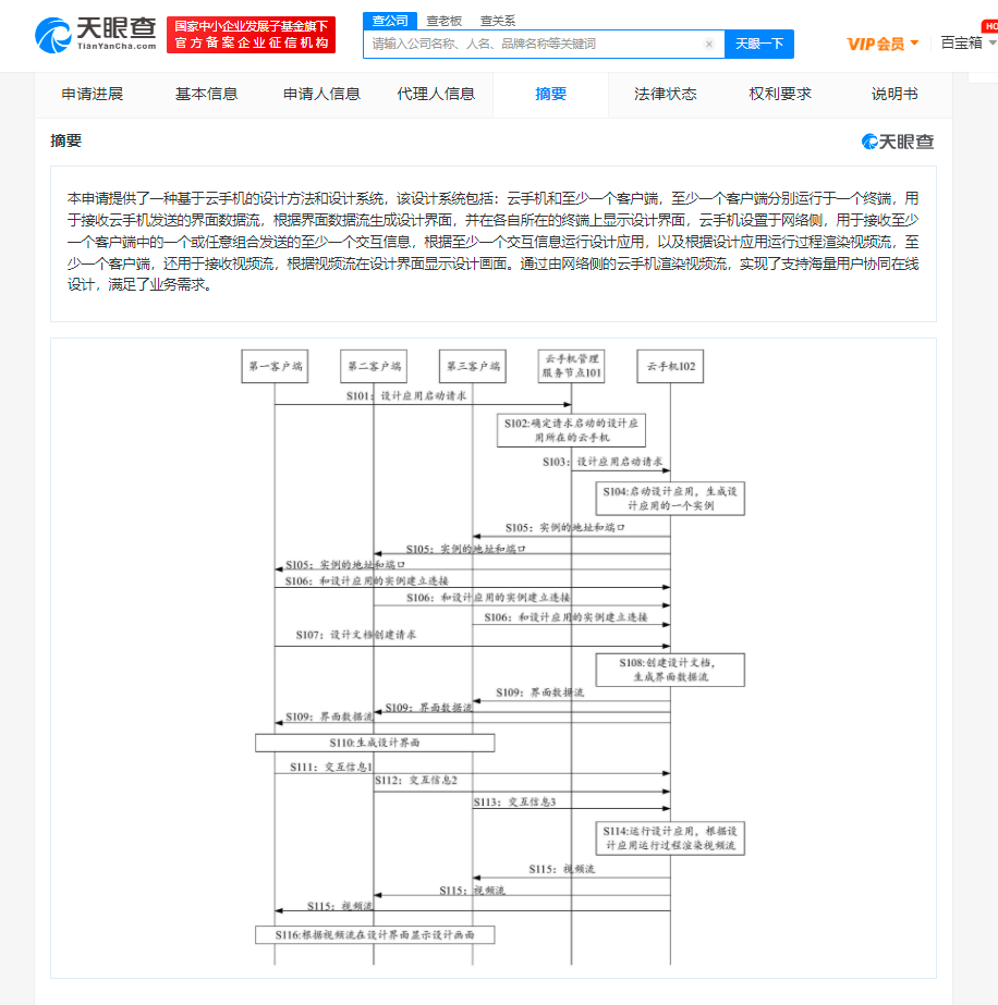 专利专利摘要显示,本申请的设计系统包括云手机和至少一个客户端。客户端分别运行于一个终端,用于接收云手机发送的界面数据流,从而生成并显示设计界面;云手机设置于网络侧,用于接收交互信息,进而运行设计应用并渲染视频流;通过由网络侧的云手机渲染视频流,实现了支持海量用户协同在线设计,满足了业务需求。