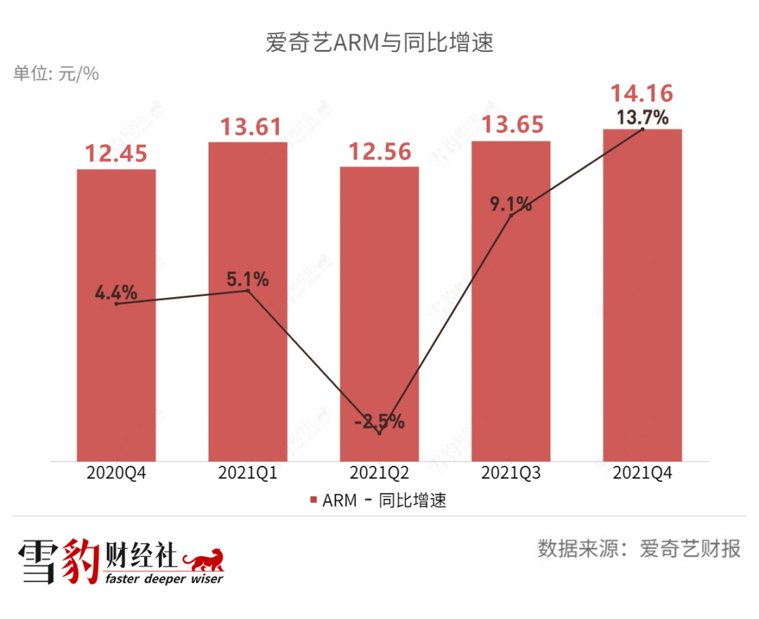 涨价带来的效益明显。2021年第四季度,爱奇艺会员服务营收41亿元,同比增长7%,这得益于ARM(月度平均单会员收入)的增加。ARM从去年同期的12.45元涨至2021年四季度的14.16元。龚宇称,提升ARM是未来爱奇艺会员业务的核心战略方向之一。