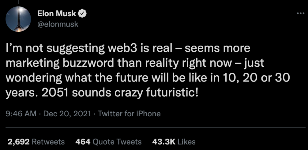 连马斯克也在社交平台嘲讽道:“相比现实,Web3现在似乎更像是营销流行语。”