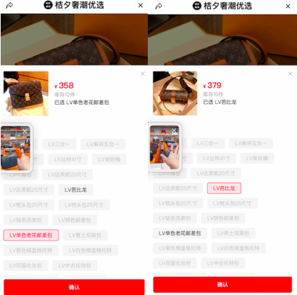 在6.4万人看过的视频号“奢牌潮装”的直播页面上,“大牌包包”云集,不管是LV经典款、还是YSL杨树林,都不在话下。另一家账户名为“娅鑫包包加工厂”的直播中,女主播颜值气质均到位、香肩微露,讲起包包的工艺和成色来如数家珍。