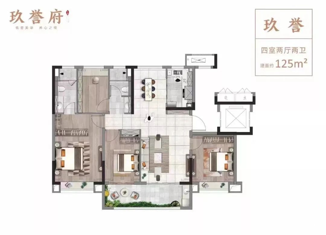125㎡四室两厅两卫户型图:四开间朝南,双阳台设计,南北通透,客卫干湿分离,主卧套房设计,L形厨房。
