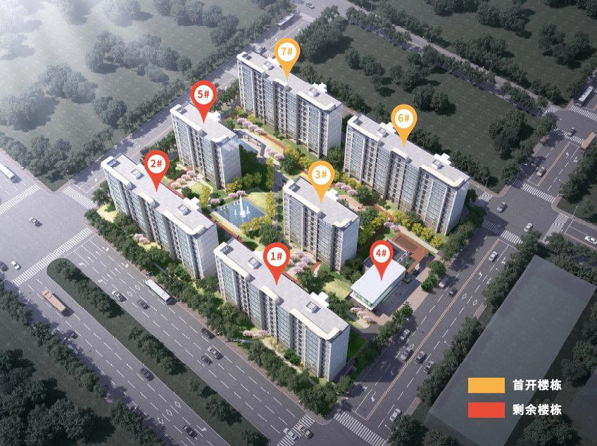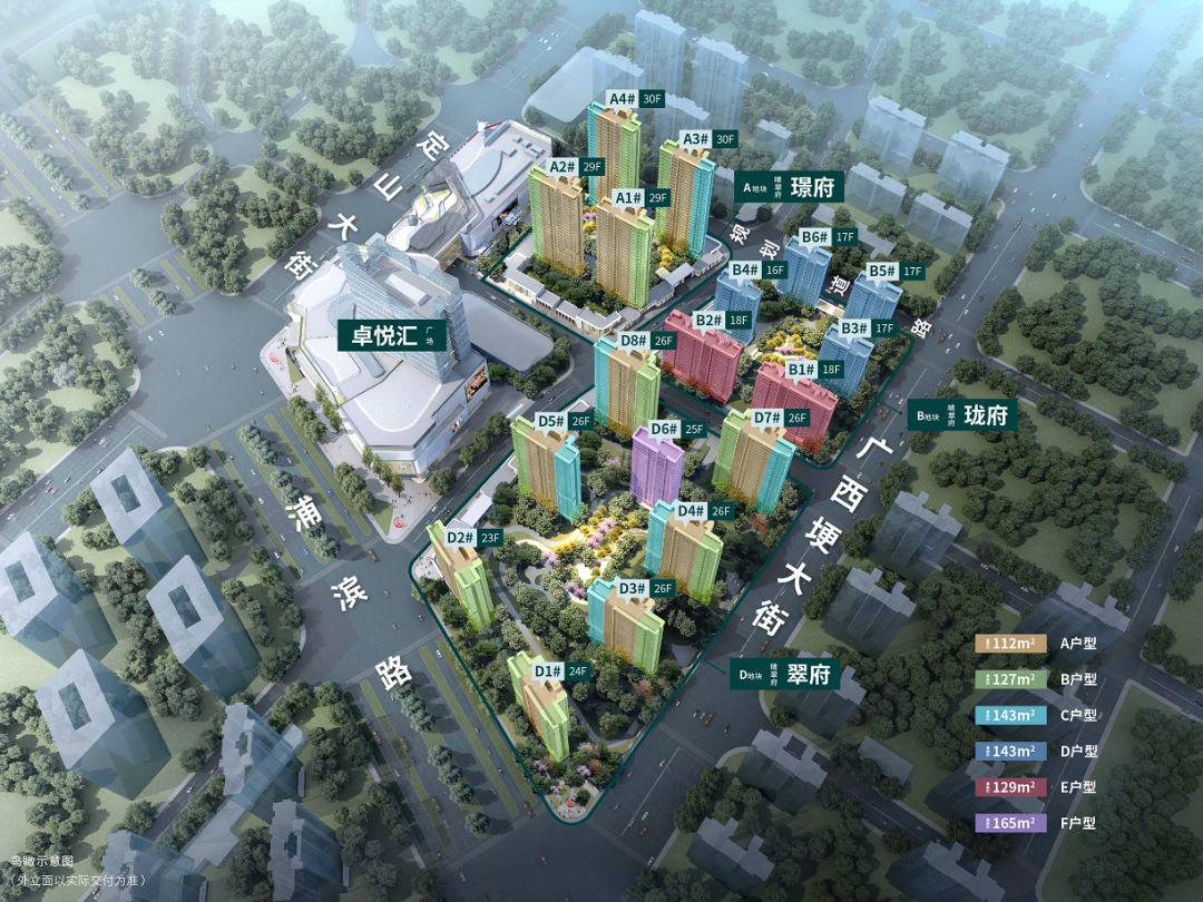 晴翠府主力在售珑府1号楼、翠府4号楼,共176套房源,建筑面积约112、127、129、143㎡,销许均价37020元/㎡,首付8成,验资308万元,预计2023年12月交付。