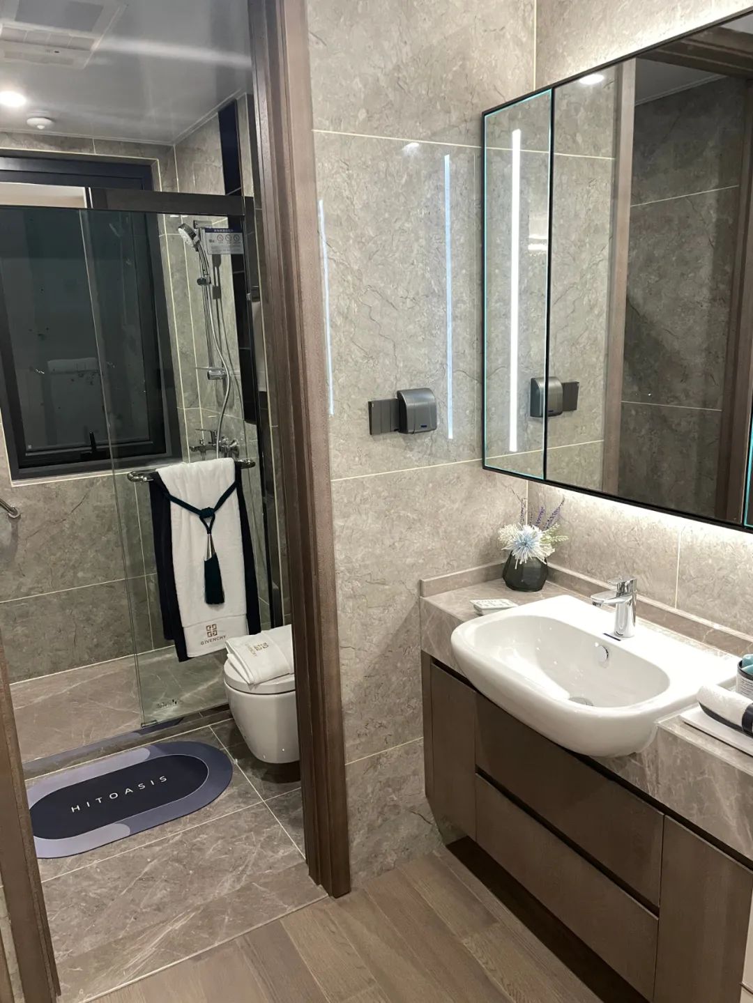 卫生间整体采用的是杜拉维特,高仪等品牌,干湿分离,卫生间里还有扶手,方便老人、孕妇、小孩。