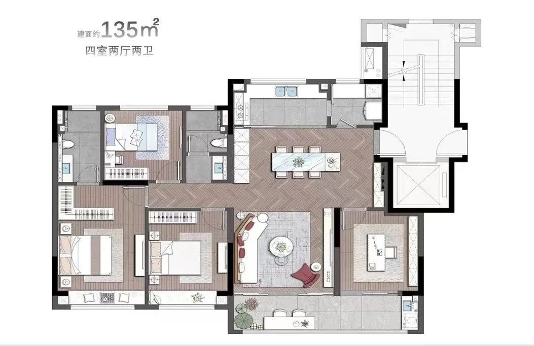 140㎡四室两厅两卫户型图:四开间朝南,双阳台设计,南北通透,客卫干湿分离,主卧套房设计,L形厨房。户型和125㎡几乎一致,只是面积更大一些,居住起来会更加舒适!