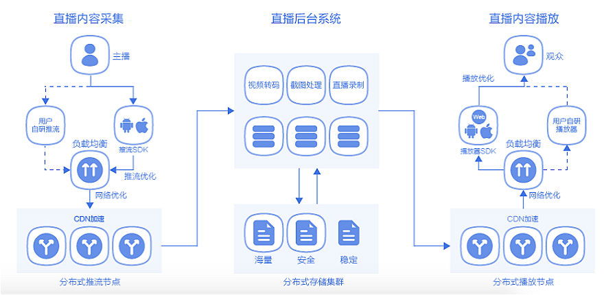 一段视频从主播端到用户端,基本可以分为三大主要步骤:“采集”、“推拉流”和“转码播放”。