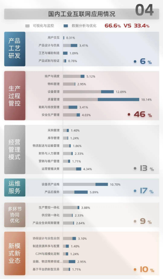 根据中国信通院统计数据显示,在1000多个工业互联网应用案例中,工业互联网技术更多地被应用于生产过程管控和运维服务环节,占比分别达46%和17%,质量管理、能耗排放管理等传统领域由于优化价值大、切入门槛低,故增速亮眼。