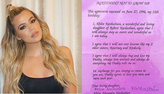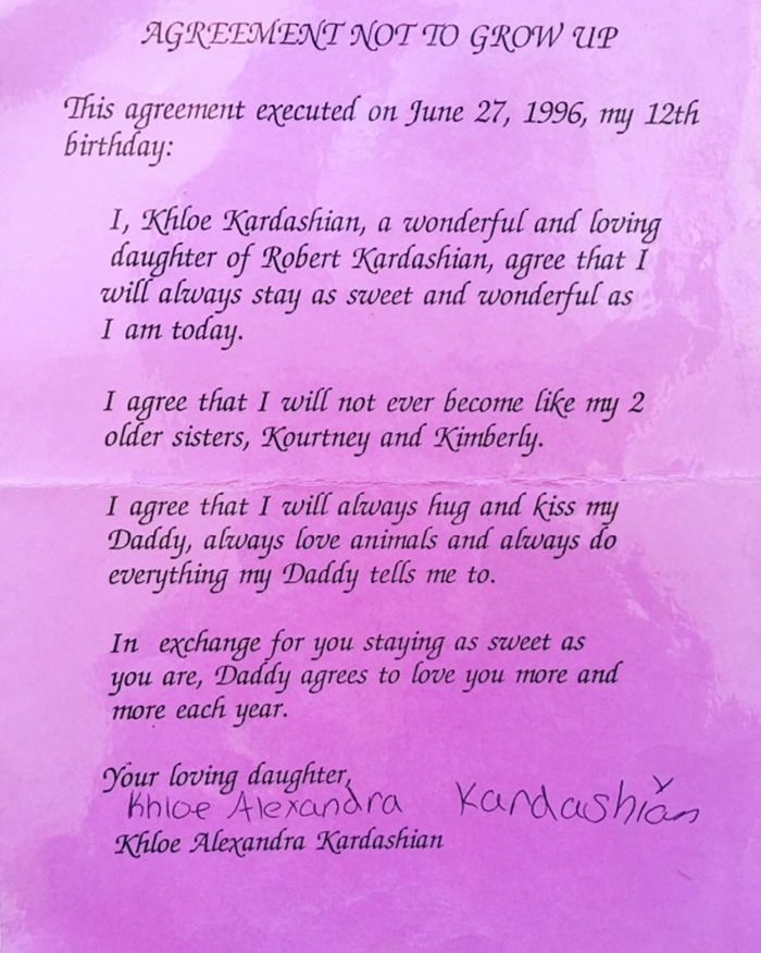 事情是这样的,在20年前,她签了一份父亲罗伯特·卡戴珊(Robert Kardashian)准备的文件,上面写着她向父亲保证,自己永远不会长大,并且会一直“像今天这样可爱,这样乖巧。”,罗伯特是一名律师,所以这份文件是相当正式的。在女儿生日当天,克里斯·詹娜(Kris Jenner)把这份萌死人的协议书po上了Instagram。