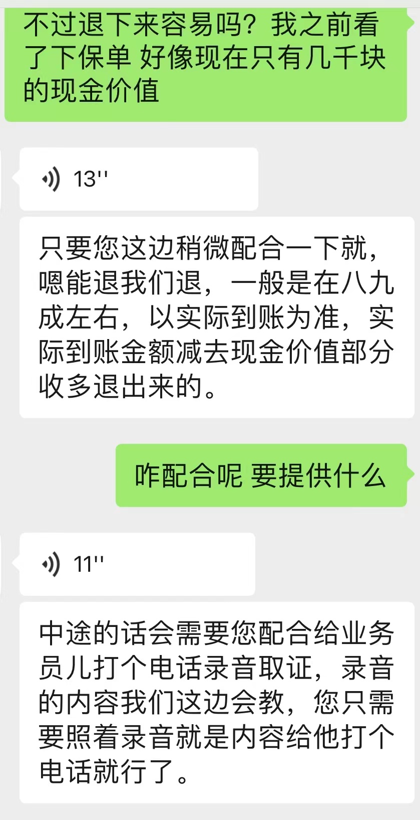在交谈中,对方会问当时的保险销售有无离职,有无返佣或者赠送礼品,并表示退保是从投诉代理人开始的。他们会提供一系列话术给投保人,投保人给当时的代理人打电话并获取到误导销售的录音证据。之后退保代理向保险公司或者银保监会投诉,要求全额退还保费。