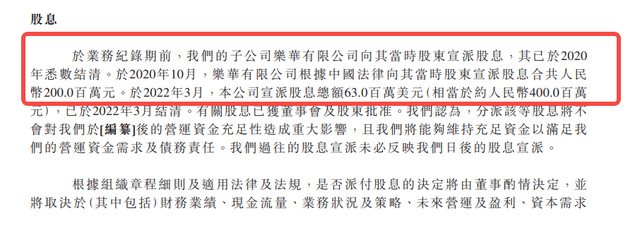 资料显示2020年乐华娱乐分派股息2个亿,2022年3月在上市前再度分派股息4个亿,总计派息分红金额达到6亿元,将前3年盈利的7.46亿元瓜分殆尽。