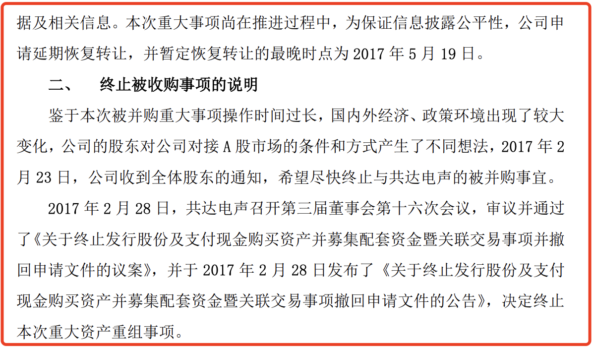 最终,共达电声和乐华文化选择了分道扬镳。贝多财经了解到,共达电声、乐华文化在2017年2月28日发布的公告显示,乐华文化的股东对该公司对接A股市场的条件和方式产生了不同想法,决定终止与共达电声的重大资产重组事宜。