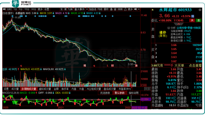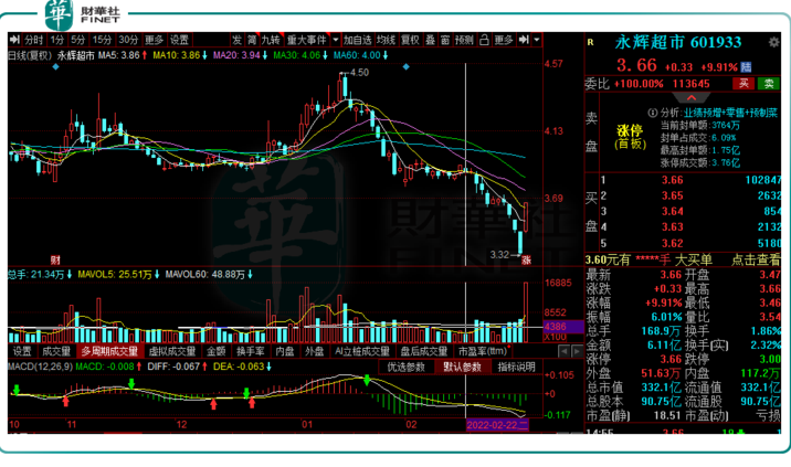 3月9日,永辉超市放量跳空高开,不久便封上涨停板,收报3.66元/股,盘后仍有超10万手大单牢牢封板。