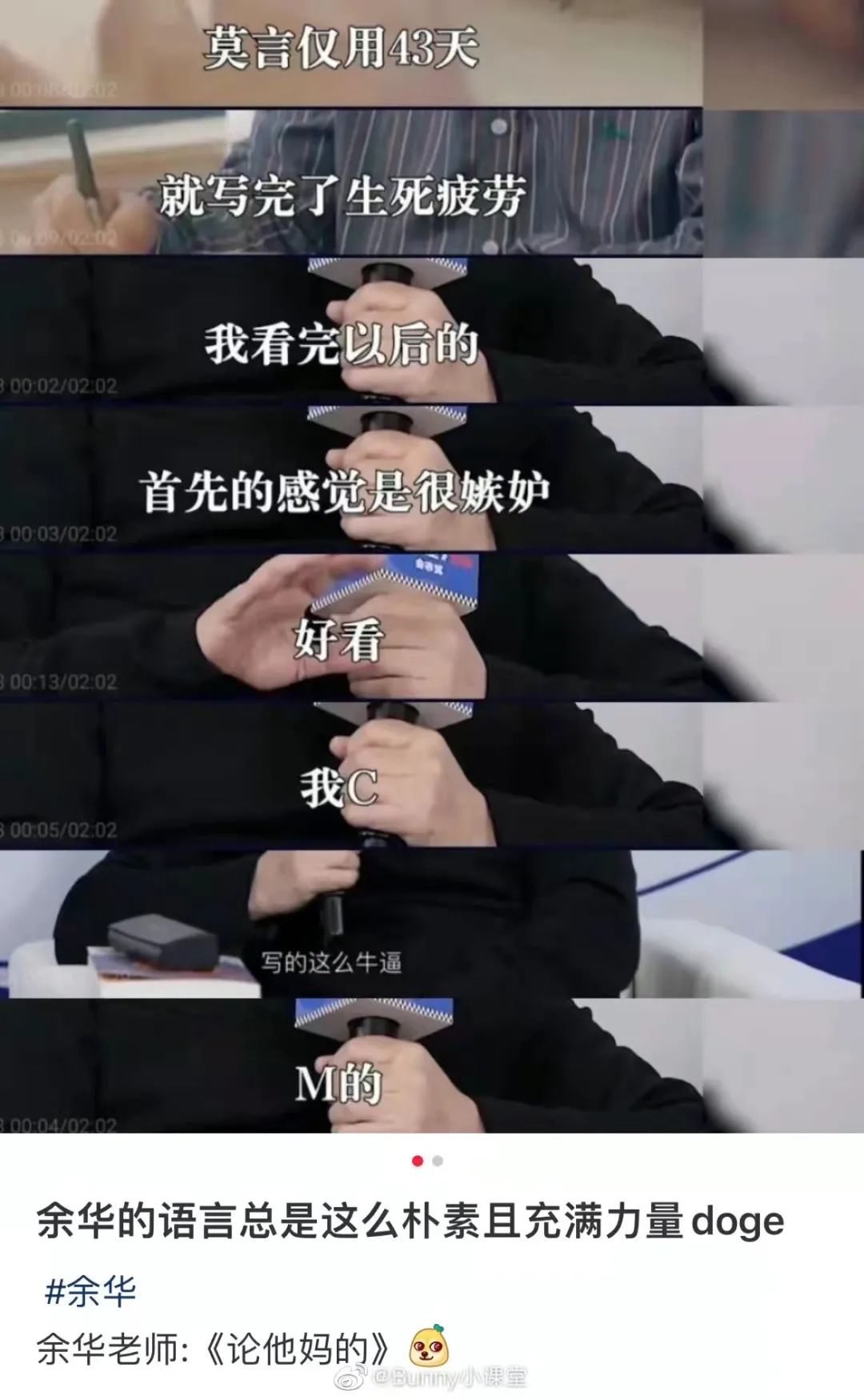 另一个值得永流传的经典片段是,评论莫言新书时的“国粹”三连。