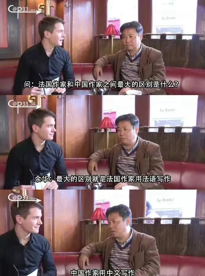 当法国记者问他:“法国作家和中国作家最大的区别是什么?”他嘴角上扬,差点控制不住要笑场,但还是假装冷峻地回答这位记者: