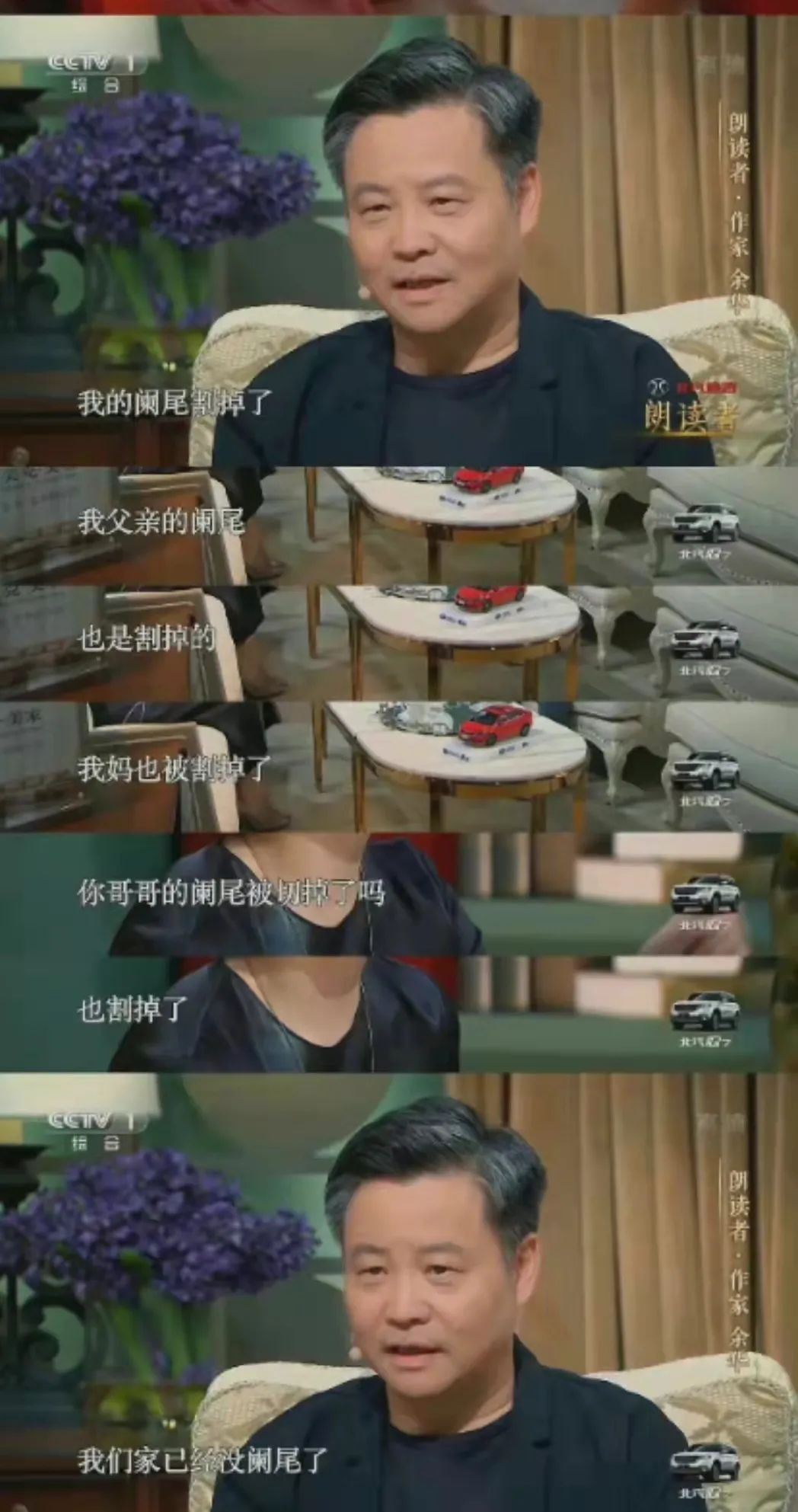 就连参加央视的综艺《朗读者》时,他也没能严肃起来。在节目里,余华分享了自己小时候装病而被当医生的父亲割掉阑尾的故事,荒诞的描述让这个悲伤的故事听起来有种无厘头的喜感,以至于网友们听到“我们家已经没阑尾了”,笑的DNA就会自动工作。