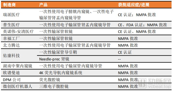 其次,包括荧光内窥镜、3D内窥镜等在内的内窥镜也均有新发展。这些内窥镜以腹腔镜为主,可用于泌尿外科场景;功能上主要向着成像更清晰、识别病灶更精准的方向发展。目前在这些创新内窥镜领域,国内企业均有布局。而结合新技术的创新内窥镜也正是国产品牌对进口品牌的超车弯道。
