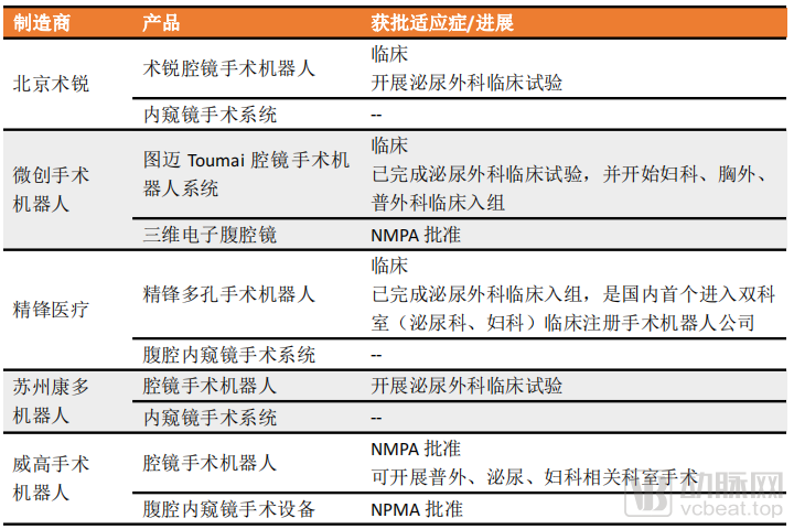 据悉,目前我国市场上已有多家腹腔镜手术机器人在获批、临床等不同阶段。其中已获批的威高手术机器人可用于普外、泌尿、妇科相关科室手术;微创机器人、精锋医疗、术锐、康多等多家机器人也已经相继开展泌尿外科临床试验。