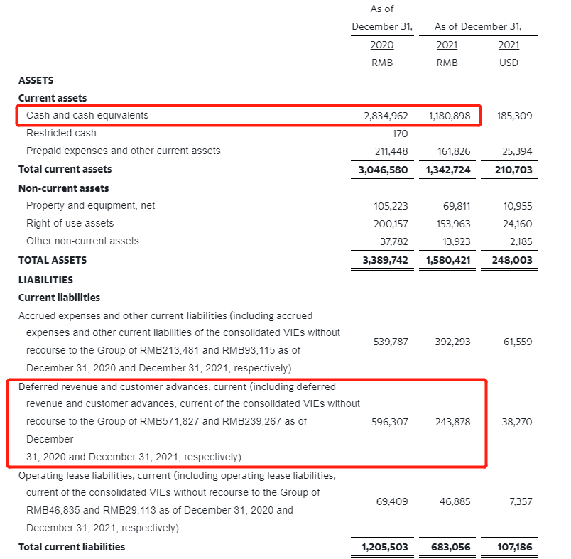 截至2021年12月31日,一起教育持有的现金和现金等价物为11.81亿元(合1.853亿美元),而截至2020年12月31日则为28.35亿元。同比大幅减少近17亿元,这还是在各项费用大幅缩减的情况下出现的,现金遭受的冲击程度可见一斑。