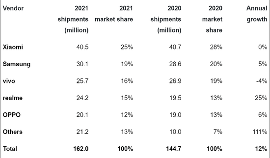 Canalys发布的2021年印度智能手机市场的出货量数据显示,Top 5中有4家是中国手机品牌,其中小米占比25%,三星占比19%,vivo占比16%,realme占比15%,OPPO占比12%。