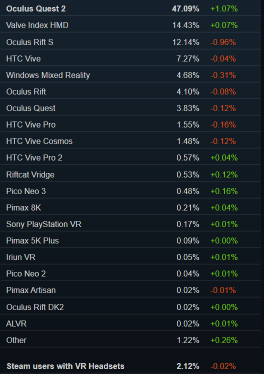 过去两年Meta能够狂卖出超过一千多万台Quest 2设备,除了这款VR头显价廉物美之外,不断丰富的Quest Store内容生态同样功不可没,而如今从最新的Steam VR设备占比来看,Quest 2几乎凭一己之力占据了半壁江山,足以见得软硬结合对于如今VR平台的重要性。