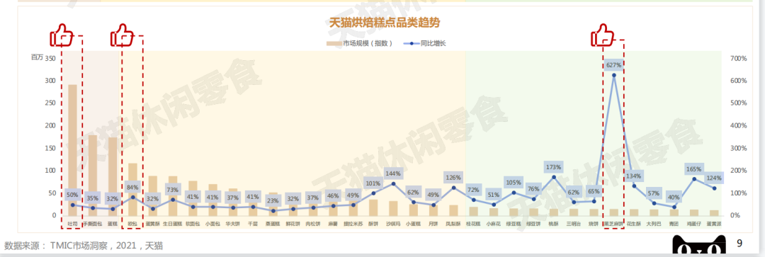 比如说,黑芝麻饼。在2021年天猫烘焙糕点品类趋势中,黑芝麻饼的增速可谓一骑绝尘。