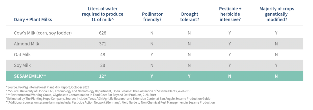 杏仁种植需要蜜蜂在很短的时间内为小树林授粉,数以百万计的蜜蜂被运送进来,超过30%的蜜蜂死于压力和农药中毒。而芝麻能够自花授粉,避免商业蜜蜂的大量牺牲。此外,相比因高用水量而臭名昭著的杏仁奶,Hope &Sesame指出其芝麻奶的生产用水量比杏仁奶少 95%,比燕麦奶少 75%。造成这种情况的一个重要原因是芝麻是一种耐旱植物,因为它具有广泛的根系,并且能够在炎热干燥的地区生长良好。